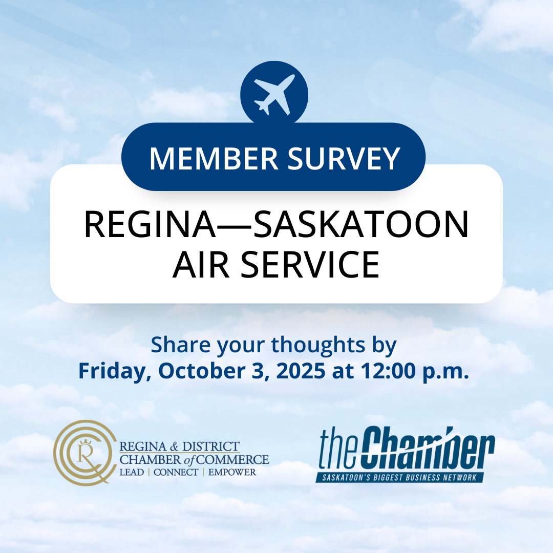 The Regina & District Chamber of Commerce and the Greater Saskatoon Chamber of Commerce are gathering input from members on their interest in and potential usage of a seasonal, twice-daily, non-stop air service between Regina International Airport (YQR) and Saskatoon Airport (YXE).