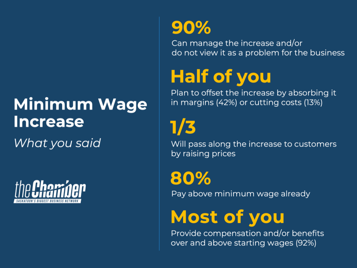 On October 1, Saskatchewan’s minimum wage will increase to $15.35 per hour - up 35 cents from the current hourly rate. Through a survey of Chamber members, we asked how you plan to manage the increase and what impact it will have on your operations. Thanks to everyone for your responses and comments. We’ve summarized the findings and have provided them to provincial Minister Jim Reiter and his officials in Labour Relations and Workplace Safety.